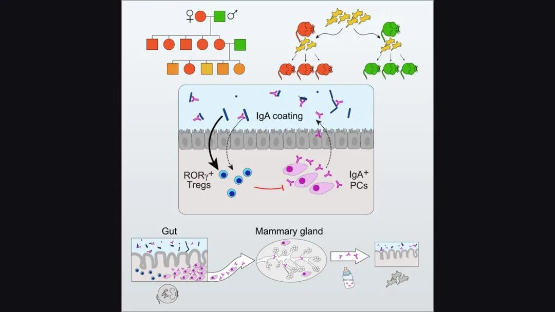 而且这样的 IgA 还能随着母乳转移到小鼠的肠道当中去影响小鼠的肠道中这一类调节性 T 细胞——也就是 RORγ 阳性的 T 细胞的数量。