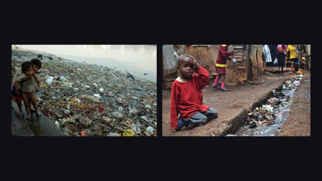 比如说左边这张图,这是在印度的恒河边,我们看到这些孩子们在这边成长;右边是非洲的贫民窟的情况,所谓不脏就如此直观地体现给大家。这是不脏当中的非常重要的一点,就是不要再脏乱差,尤其是在有可能造成严重的卫生问题的这样环境当中让孩子生活。