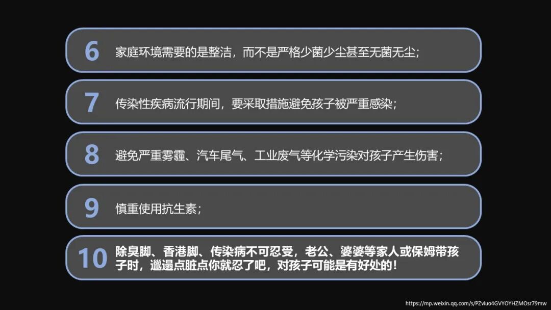 第十非常有意思,我也常常讲,有时候家庭里面有一些老公、婆婆甚至保姆,个别时候的卫生习惯达不到最高的要求,在这个时候其实适当多一点理解,那么能用相对比较平衡的卫生习惯来在家庭当中营造一个非常好的氛围,不仅仅有利于孩子健康,甚至有利于家庭里面的感情和谐。