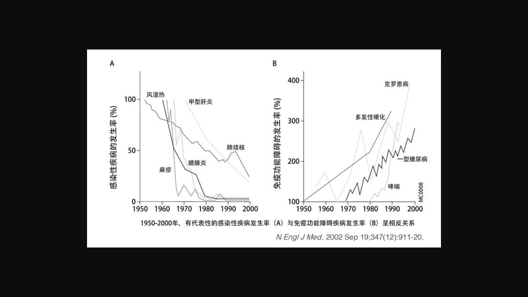 但是我们也明显地看到哮喘、1 型糖尿病、多发性硬化以及克罗恩病等等这样的与自身免疫功能障碍息息相关的疾病大幅的高发。