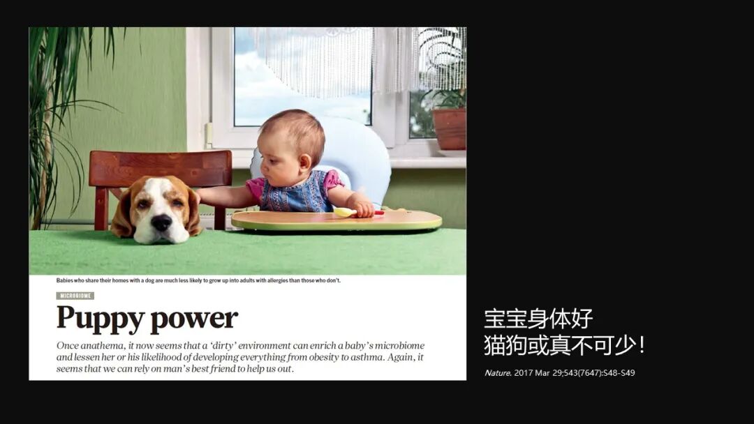 当然在过去几年的文献,包括顶尖杂志的报道当中,包括我们的科普当中也多次提到,确保安全的情况之下,在家里面养猫、养养狗有可能会带给宝宝更好的多样性的微生物刺激,避免过敏、哮喘等疾病的发生。