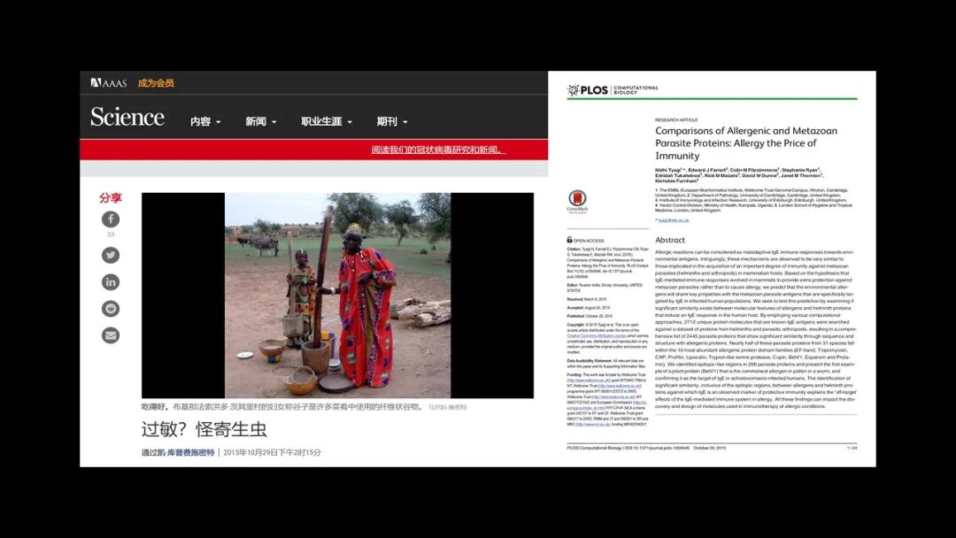 这里面让我印象非常深的是说科学家甚至找到了某种特定的寄生虫身上的蛋白与能够引起花粉过敏的桦树花粉里面的一个蛋白是类似的。把 31 种寄生虫里面的超过 7 万种的蛋白质进行比较发现,在寄生虫当中有 2400 多种的蛋白质与致敏蛋白非常相似。