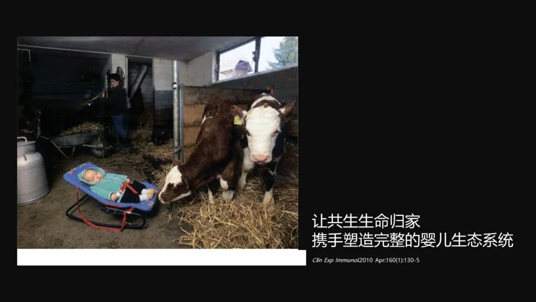 在一些科研杂志当中,甚至有这么过激的,把宝宝们养在一个牛栏里面。但是让共生的生命归家能够在婴儿的身体当中建立起一个非常好的、完善的生态系统,这是非常必要的。