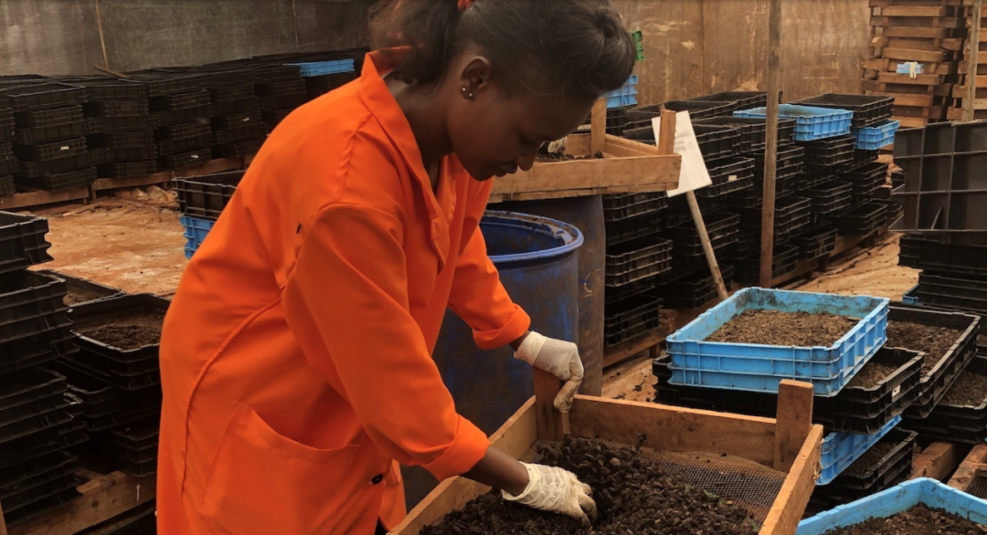 图.在肯尼亚 Limuru 的昆虫农场,一名工作人员正在收获黑蝇幼虫。昆虫消耗食物垃圾并将其转化为蛋白质。拍摄:Emilie Filou
