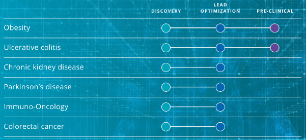 根据官网信息,其中 2 条管线(针对肥胖和溃疡性结肠炎)已经处于临床前阶段,并计划在今年开始人体试验。