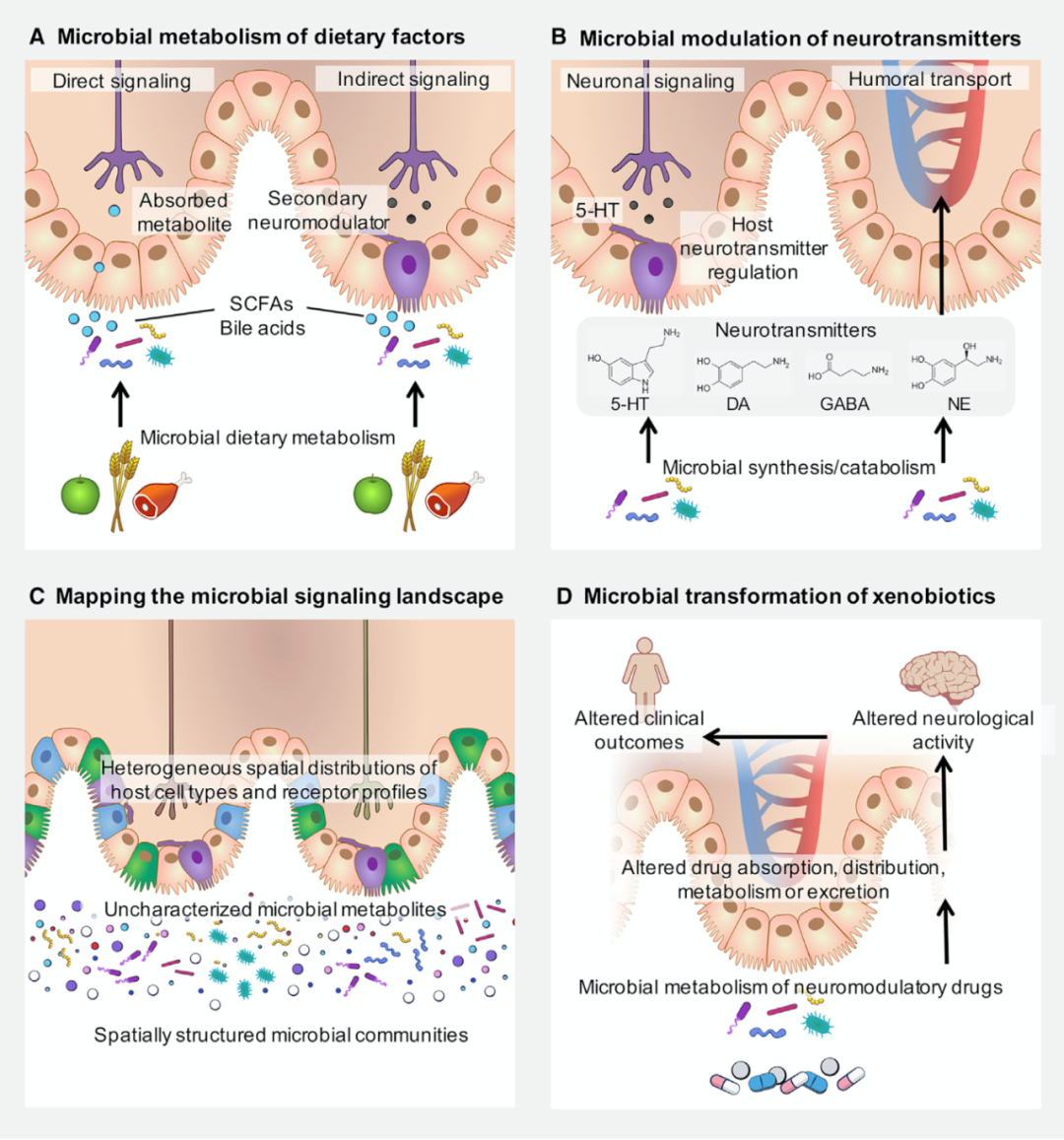 因此,目前尚不清楚这些机制是否会对宿主最终的临床相关结局产生影响。需要利用基因追踪细菌种类和无菌疾病动物模型技术的实验,评估微生物对药物的特定性功能与神经性行为结局之间的关系。