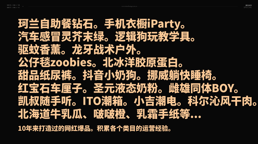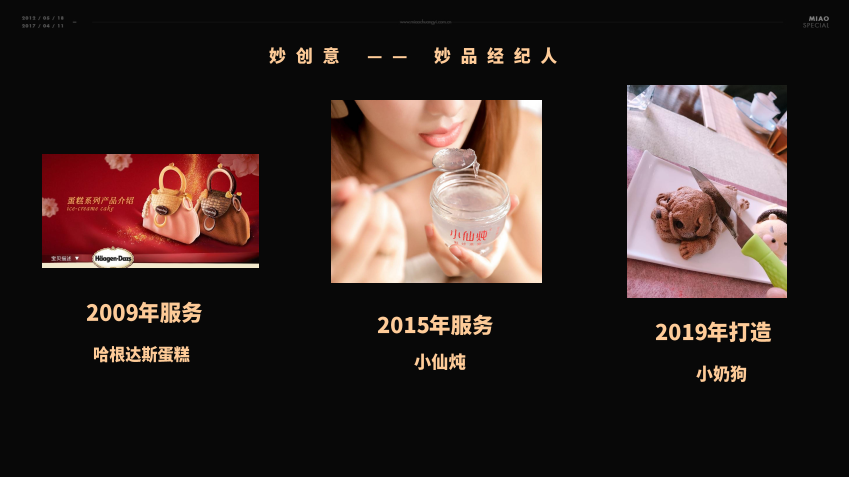 我叫苏然,我在妙创意工作。我们在 10 年前创建了一家公司叫“妙创意”,主要就是做爆品的打造,从最早的哈根达斯,到后来服务小仙炖,再到 19 年,像“小奶狗”这样的一个把巧克力模具和慕斯蛋糕混在一起,然后可以切的狗蛋糕,在网上去火爆。