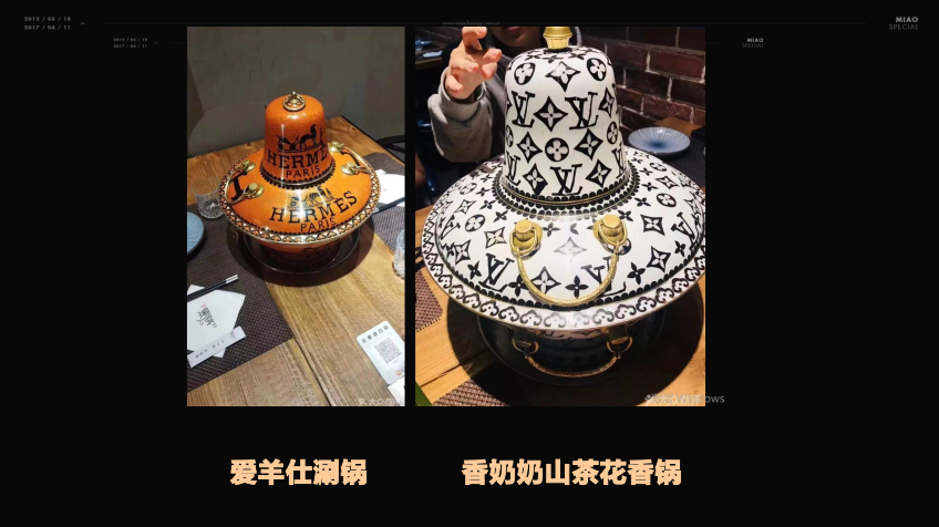 我们的火锅,它是一个旧的元素,我们如果把它混搭一个更新的元素,比如说我把它混搭 LV,我把东来顺混搭香奈儿,能混出什么?能火吗?我们看一下,其实它也是有机会火的。你可以做一个爱羊士香锅、香奶奶山茶锅,里边可以涮一些驴排、驴肉。