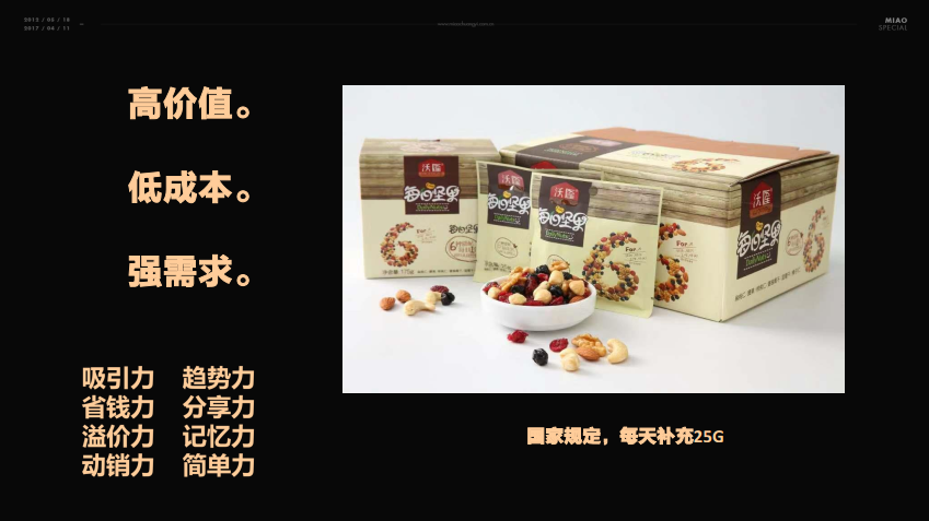 坚果是什么时候吃?坚果在以前都是很低频的,它的频率是很低的。但是牛奶不一样,牛奶每天都在喝,牛奶成箱可以卖的,高周转,一天一包,补充蛋白。那如果我把这些元素全部都加到这个里边来,能不能创建一个可以卖爆的产品呢?
