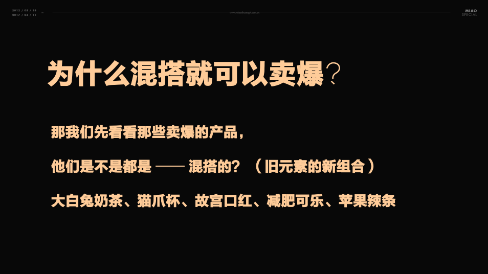 混搭其实也可以翻译为,旧元素的新组合。大家可以去想一想,在最近几年的时间内,那些卖爆了的产品,它们是不是都具备“混搭”这样的一个底层逻辑?