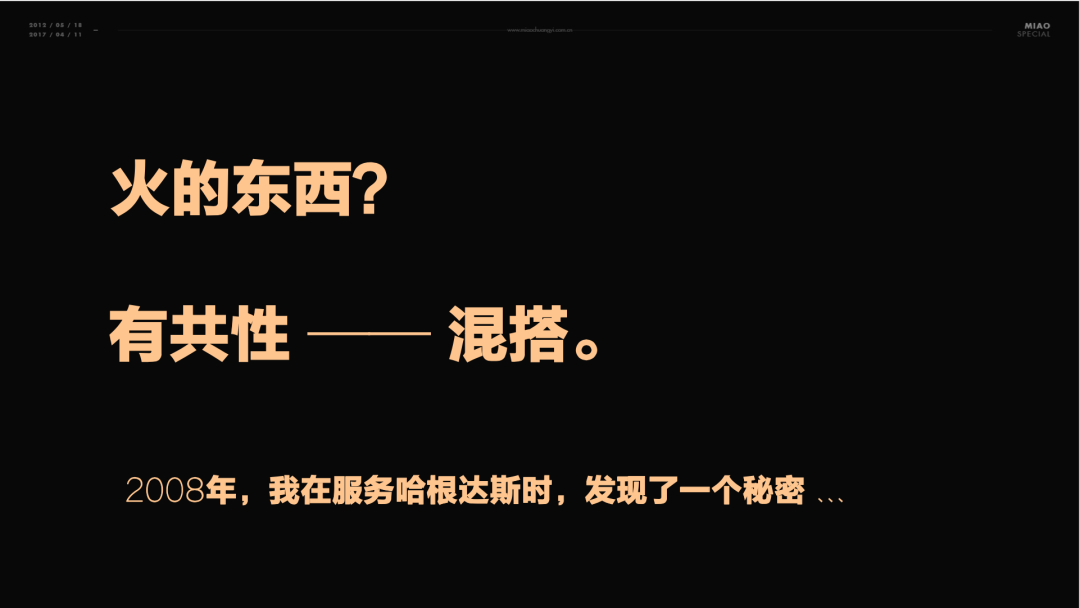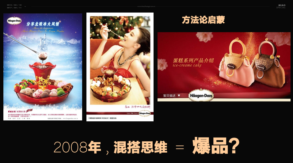 所以每一个火的产品背后都是混搭的。这个是我从在08年的时候,我在服务哈根达斯的时候发现的。我们在那时候发现,如果我们用一个旧的元素混搭一个新的元素,这个产品就会变得不一样。