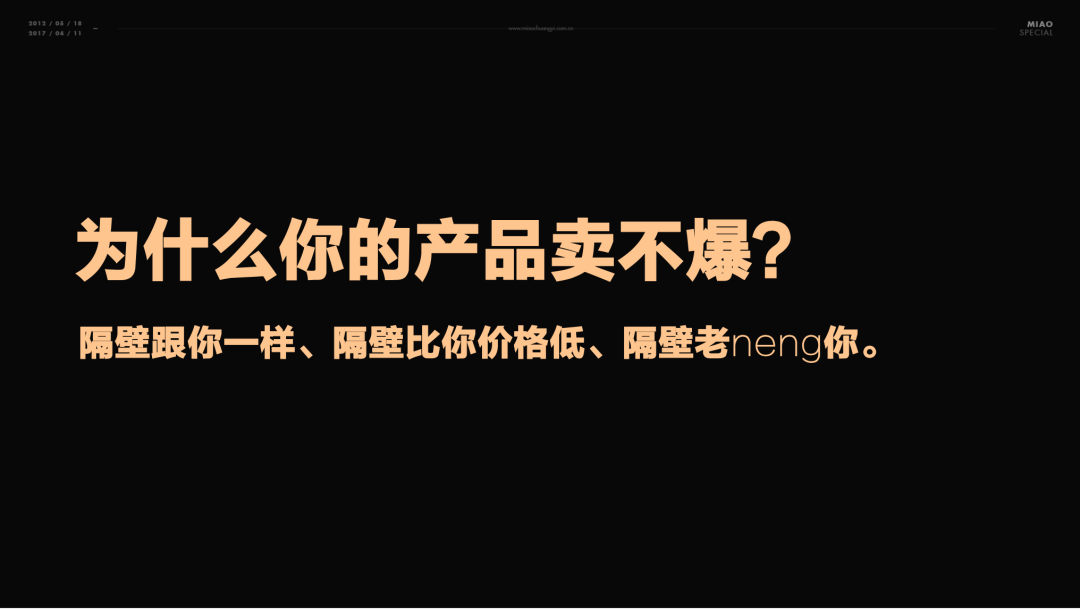 那么想要你的产品卖爆,首先你要先弄清楚,为什么你的产品卖不爆?我分析了一下,基本上就以下三个原因:第一,隔壁老王卖的跟你一样;第二,隔壁老王卖的比你价格低;第三,隔壁老王老弄你。