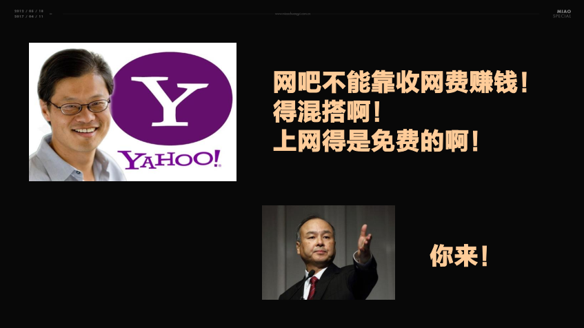 杨致远就想,我干脆我做一本黄页,我能不能通过别的方式来挣钱?我能不能混搭一个新的商业模式进来?就是我本质上我可以做一个媒体,我可以做一个门户,我靠广告去收费,混搭黄页的商业模式进来。孙正义当时说:好,你厉害,你来!
