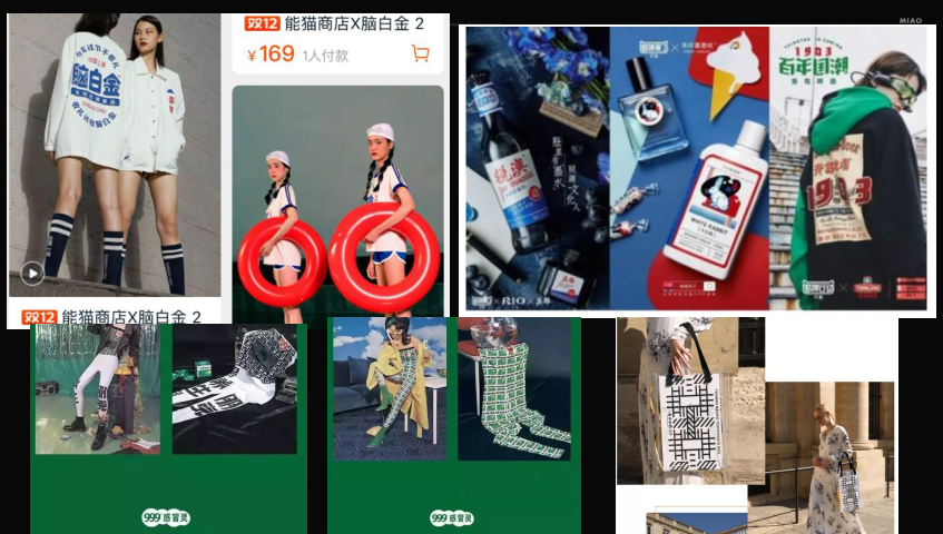 最近你们可以看见,大量的品牌——青岛啤酒也在做发布会,也登陆时装周;大白兔也出自己的身体乳;甚至说脑白金也出这样的混搭的产品。