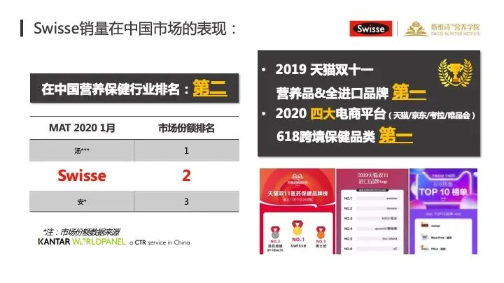 从我们去年年底第三方 KANTAR(凯度)的数据——从消费者端统一的口径来统计,斯维诗目前已经在中国市场排到了营养品品类的第二名,仅次于汤臣倍健,而且我们在双 11 的时候,在不同电商平台上面取得了相应品类的第一名。