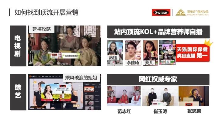 还包括电视剧,前两年大家都知道可能最爆的一个电视剧《延禧攻略》,我们很快的有广告进到里面去。包括我们在一些顶级的平台上面,跟很多的主播像薇娅、李佳琦、葵儿合作,他们在首次选择营养品品类的时候,也基本上都会选择我们来做直播。