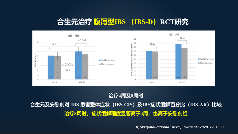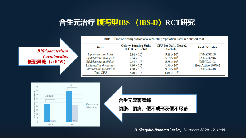 对于腹泻型的肠易激综合征,那也有一个比较新的研究,是 2020 年发表的,用合生元来治疗这个腹泻型的 IBS,用的是这个乳酸杆菌、双歧杆菌和低聚果糖,加在一块治疗四周或八周,并对病人进行随访。