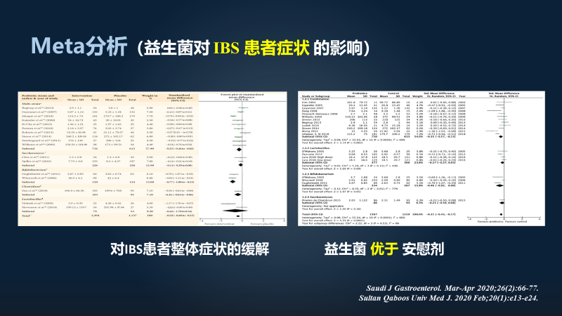 如果我们去看关于益生菌治疗对肠易激综合征的治疗效果的荟萃分析的话,总的来看,IBS 病人还是能够从益生菌治疗中获益的,特别是跟安慰剂去对照,因为我们知道,其实对功能性疾病来说,安慰剂的效果还是挺高的,大概 30%这样。那当然在安慰剂(placebo)的作用的基础上,益生菌对病人还是有明显的获益。