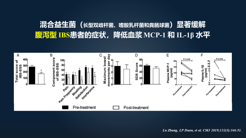 那这个是我们自己的研究,确实也是能够看到,如果我们给病人混合的益生菌(包括乳酸杆菌、双歧杆菌和粪球菌)的治疗,治疗四周以后,腹泻型IBS病人的腹部症状能够得到明显改善,症状的积分明显下降。