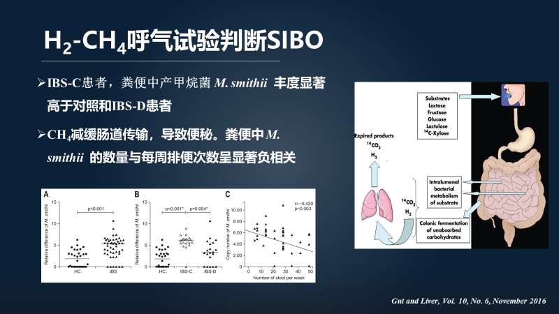 小肠细菌过度生长、菌群发生紊乱的部位主要在小肠,现在临床也有相对来说比较简单易行的办法来进行诊断。除了我们说的诊断的金标准,用近端小肠液培养以外,比较简洁的办法就是这个氢/甲烷的呼气实验。