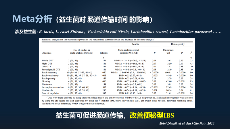 如果把这些研究放在一块,做一个系统回顾去分析的话,有一些细菌,比如说双歧杆菌、拟杆菌,它能够明显地促进肠道的传输,来改善这个便秘型 IBS 的症状。