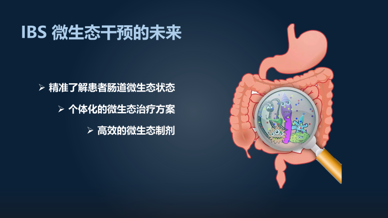 那我相信,实际上现在已经有很多医生在尝试,比如说我们通过组合的益生菌,我们通过合生元的方式,我们通过加大剂量、延长时间等等这些方法,能够来提高这个 IBS 微生态调节的治疗效果,达到改善病人临床症状的作用。