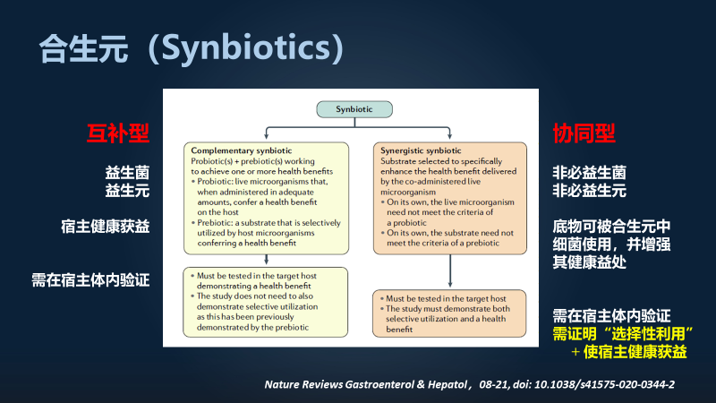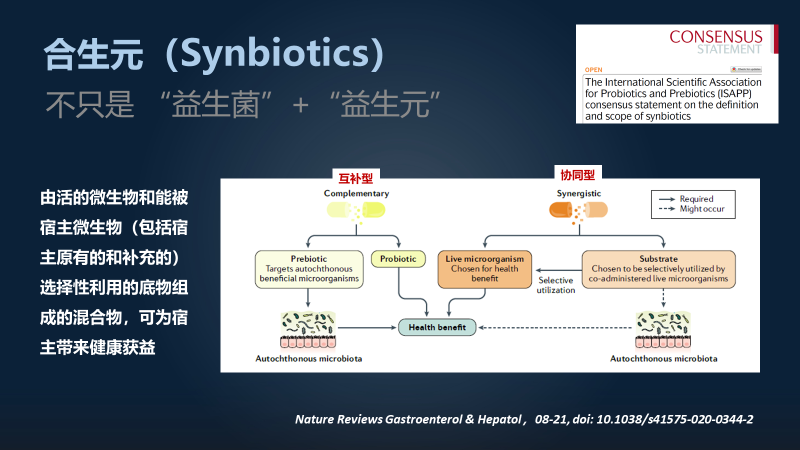 但是,最近国际的益生菌和益生元专家委员会刚刚推出一个共识,扩大和延伸了我们传统意义上认为的合生元的概念,就是在原有的益生菌和益生元的基础上,只要有活性的微生物,跟它宿主里的或者是你给进去的,或者是它原有的这些底物能够相互作用,特别是特异性的作用,能够对机体发挥有效的健康方面的作用,这个混合物都称为合生元,那么这就是现在的合生元扩展的定义。