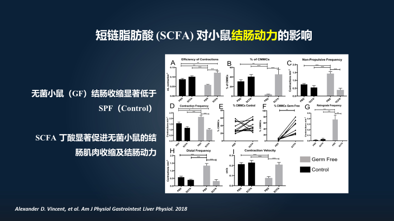 这个丁酸的实验是用小鼠来做的,就会发现对于无菌小鼠,它的肠道,无论是形态,还是它的结构,还是它的功能都是明显不正常的,那特别是肠道运动也会明显减弱。
