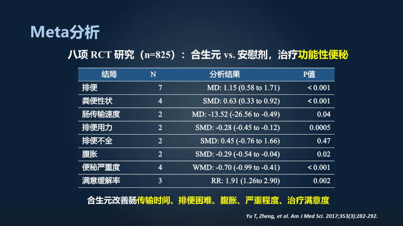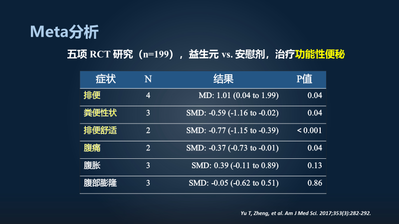 这些研究显示,益生元对照安慰剂来讲,它确实能够改善患者的症状,它对病人的排便的情况(排便的满意度以及腹部的症状的情况)都有明显的改善。