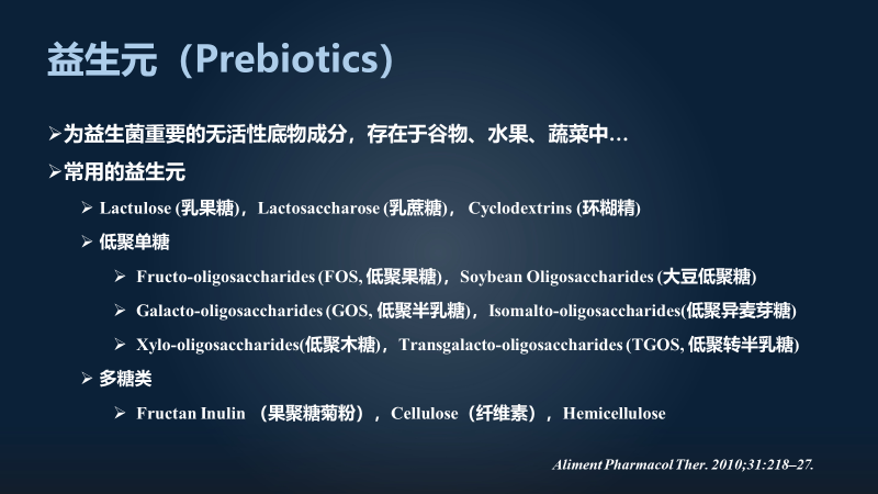 那么其实益生元广泛存在于我们日常的饮食中,比如说谷物、水果。我们大家比较知道的益生元比如说乳果糖,还有一些低聚的单糖,比如低聚果糖、低聚木糖、低聚半乳糖等等,那还有一些多糖类的一些物质。