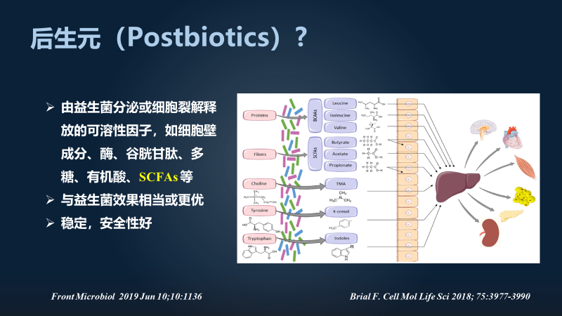 除此以外,比如说一些菌的产物,称为后生元(Postbiotics)。还有一些比如说菌破碎以后的一些成分,也可能用来影响肠道细菌的状态,那么这就是微生态制剂未来可能用于治疗的一些方向。