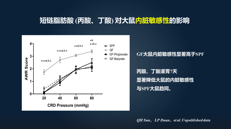 不仅如此,那这个是我们自己做的研究,也是发现比如说,我们把这个丁酸给到无菌大鼠里边,因为它没有细菌,也没有细菌产物,那我们把丁酸和丙酸给进去以后,确实能够明显地改善无菌大鼠的内脏高敏感的状态。