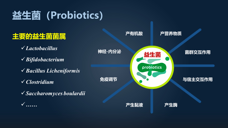 比如说它可以跟肠道里面的有害菌相互作用拮抗,比如说它可以跟机体相互作用,它可以产生很多代谢产物,这些代谢产物通过多种机制来影响机体的神经、免疫、内分泌,甚至调节这个脑-肠轴的功能。