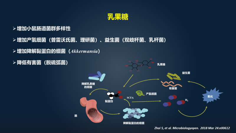 那么乳果糖除了我们刚才提到的比如说产生有机酸、降低 pH 值以外,它其实对一些有害的细菌是有明显的抑制作用,比如说这里面提到的脱硫弧菌。