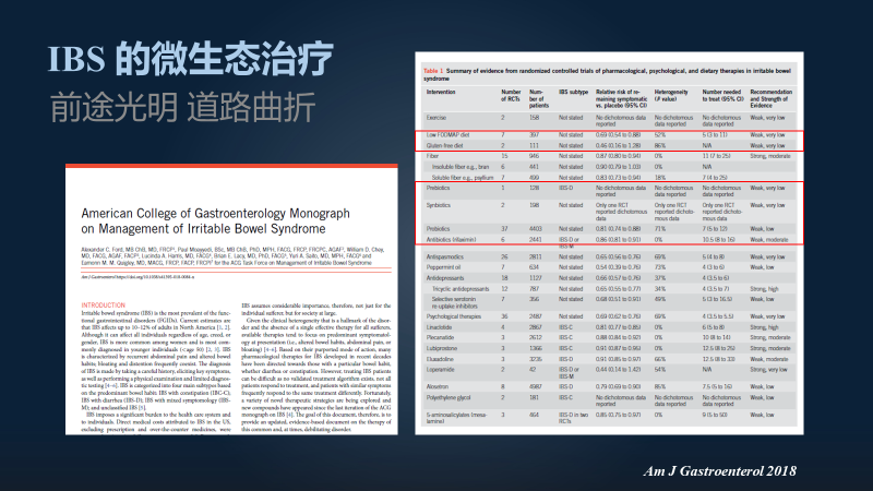 这个是 2018 年美国胃肠病学会对于 IBS 治疗的指南。对于微生态相关的治疗,比如说益生菌的治疗、益生元的治疗、合生元的治疗,还有包括抗生素的治疗,其实它的推荐等级都是比较低的,weak(弱),那么它的循证的级别也是不高的,有一些是 low(低),有一些是 very low(非常低)。