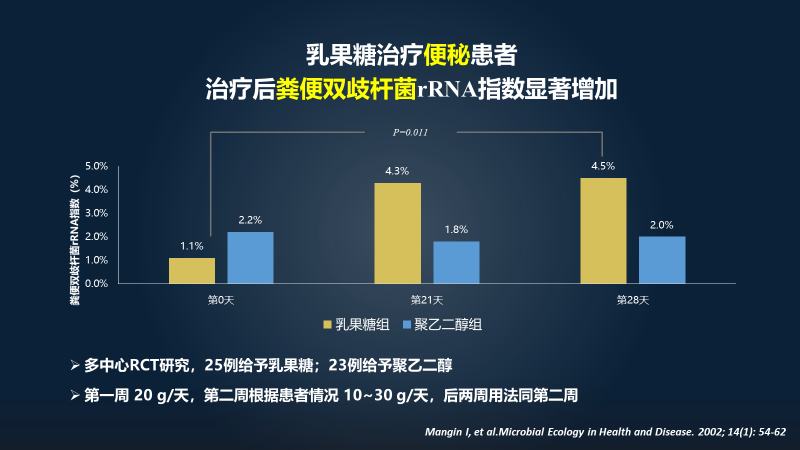 那乳果糖对于便秘的治疗,人们在传统上就觉得它就是个导泻药,那其实不仅仅如此,如果这个药用了一段时间以后,比如说在这用了四周以后就会发现,它对肠道里面的细菌是会有明显的影响。那这里显示,它对这个粪便里面的双歧杆菌有明显的增高作用。