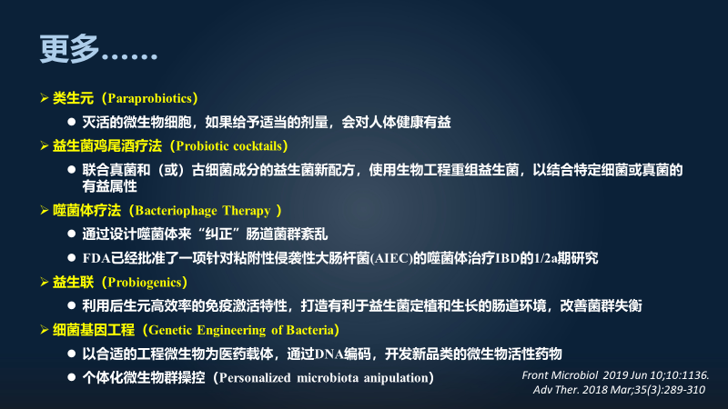 除此之外,还有很多很多。大家可以看到,还有一类微生态制剂叫类生元,就是可能细菌破了的一些碎片等等的这些物质去提炼纯化,寻找有效的成分。还有一些比如说益生菌的鸡尾酒疗法就是把益生菌、真菌和古细菌混在一块。还有一些噬菌体的疗法等等。