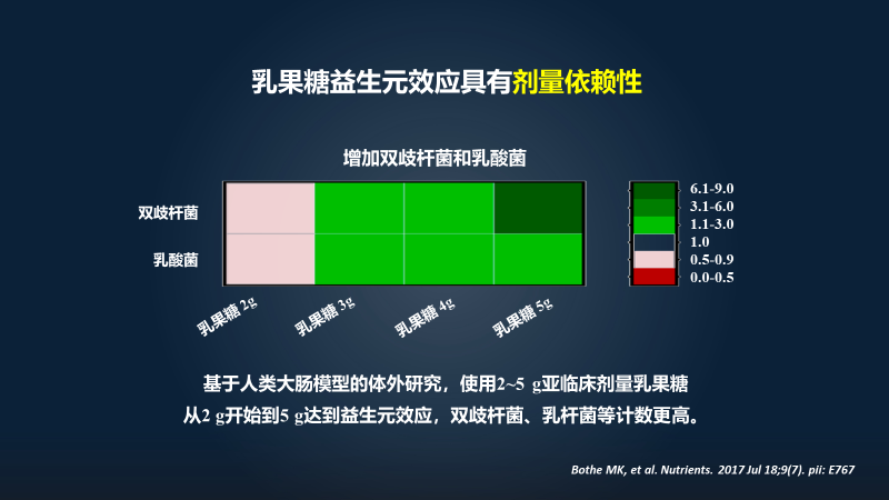 而且,随着这个用药的时间和剂量,疗效还是有一个不同的变化。这个显示的是用一个亚临床的剂量的乳果糖,用的剂量相对小一点:2 克、3 克、4 克、5 克。用这样的剂量在体外的类器官上去做实验,就发现它对我们益生菌的富集作用,比如说这个乳酸杆菌和乳杆菌,它有明显的剂量依赖性。