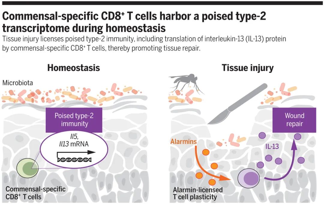 他们猜测在局部炎症蛋白(皮肤炎症过程中释放的因子)的刺激下,受伤皮肤组织内的特异性 CD8+T 细胞会触发 2 型细胞因子蛋白质的快速翻译。