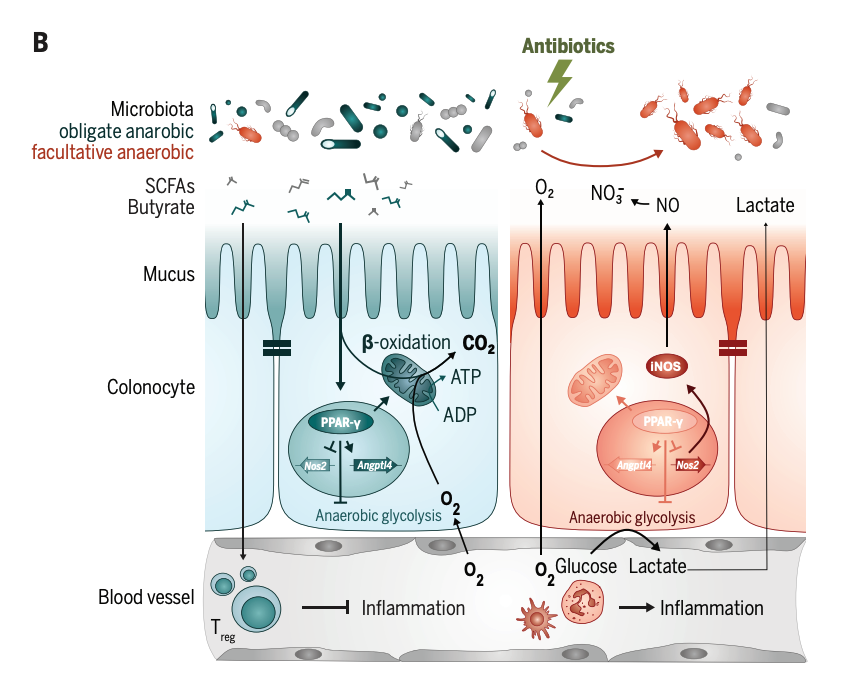 Mariana 的工作确定了:成熟结肠上皮细胞高水平的氧化代谢状态,在限制黏膜表面散发的氧气量方面起着关键作用,这有助于维持大肠腔内的厌氧环境(图 1B)[10,39]。通过这一机制,结肠上皮确保了有益厌氧微生物的优势地位,从而维持肠道稳态。