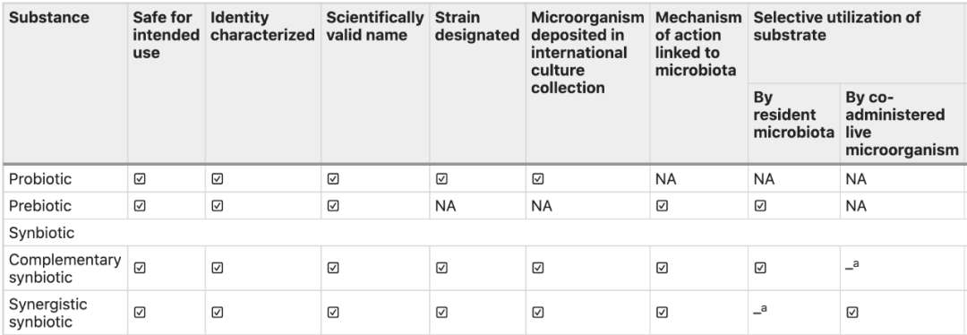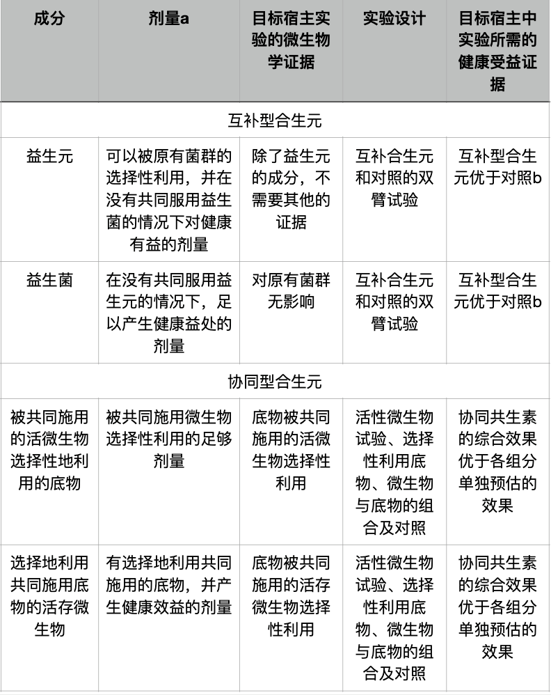合生元必须包含一种活的微生物和一种可被选择性利用的底物。对于互补型的合生元,其各自的成分必须符合益生菌和益生元的证据和剂量要求。此外,组合物必须在适当设计的试验中显示出对目标宿主的健康有益。