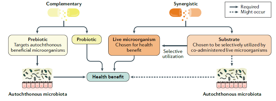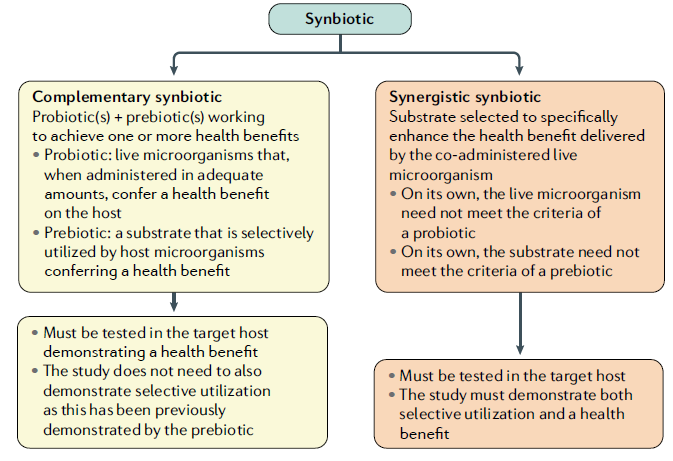 然而,有证据表明对健康有益,并不足以将活性微生物加选择性利用的底物的配方称为“合生元”,还必须同时提供证据,证明能被内源性微生物群(互补共生)或共同给予的活性微生物(协同共生)选择性地利用。